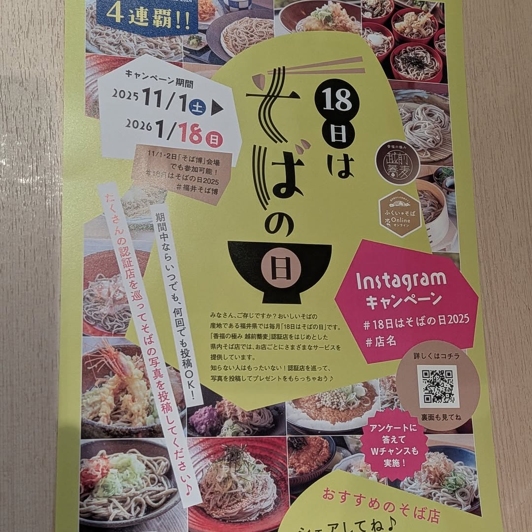 参加方法: 期間中に「福井県内のそば認証店」でそばを食べ、その写真をハッシュタグ「#18日はそばの日2025」と「#店名」を付けてInstagramに投稿。